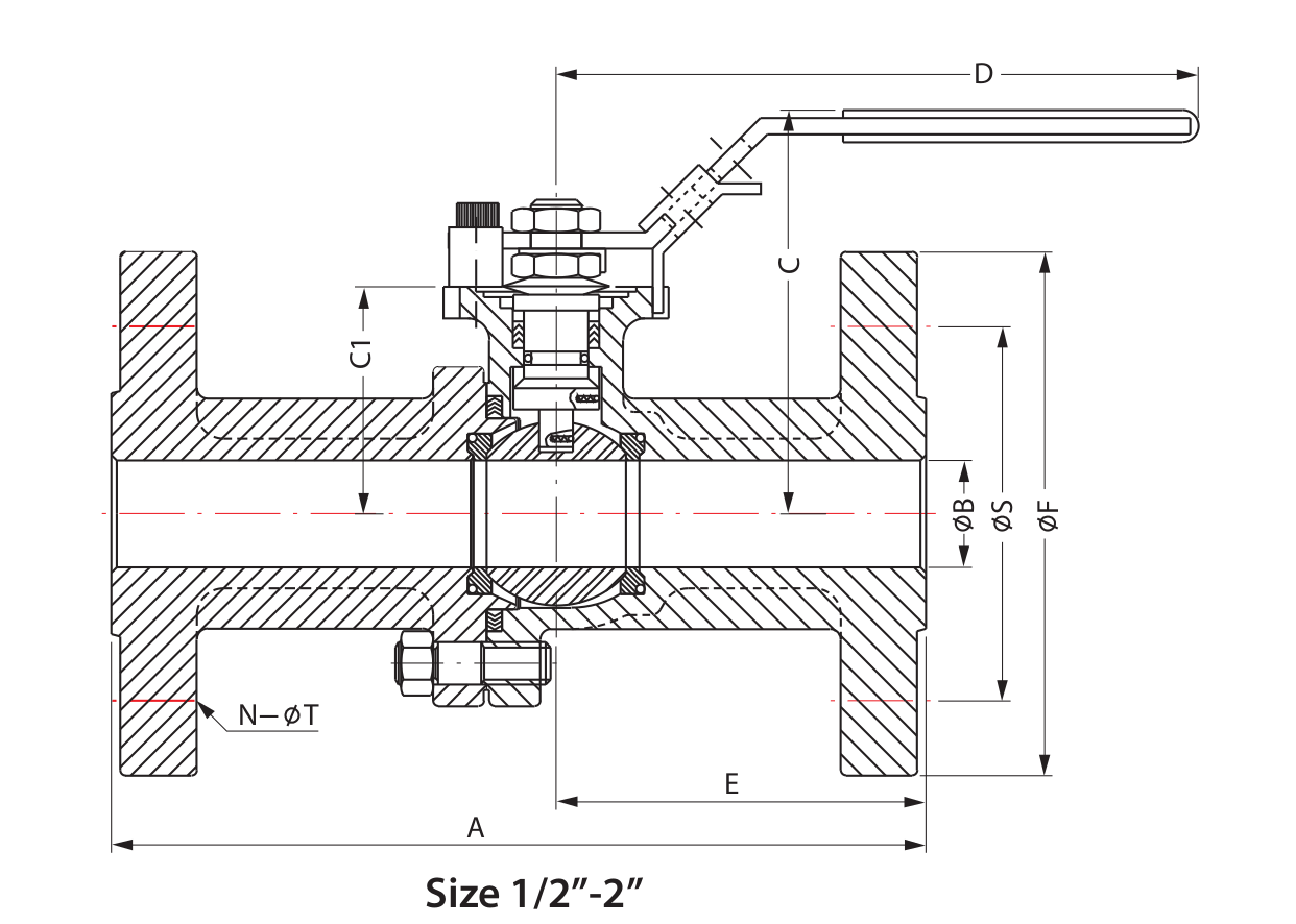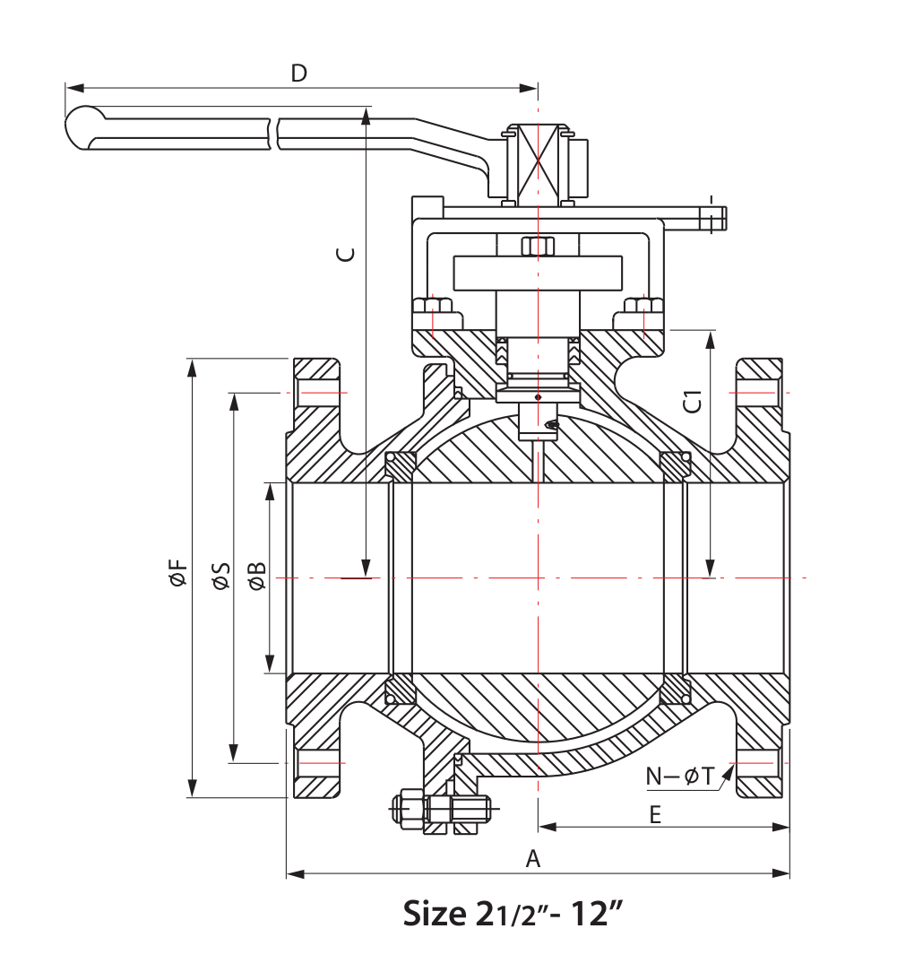 | SIZE | A | B | C | C1 | D | E | F | N | S | T | Cv | TORQUE (in-lb) | WEIGHT (lb) |