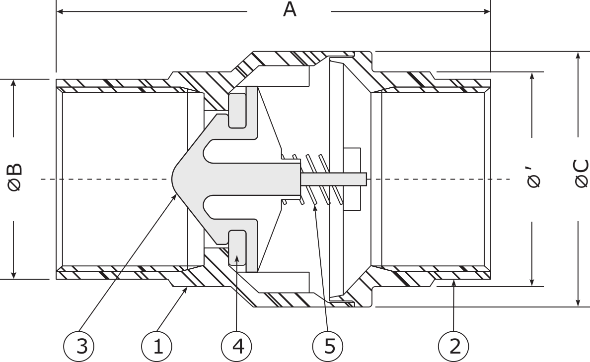 | SIZE (in) | A (in) FACE TO FACE | B (in) END DIAMETER | C (in) BODY DIAMETER | D (in) OCTAGONAL ENDS | WEIGHT (lb) | FLOW COEFFICIENT (Cv) | CRACKING PRESSURE (psi) |