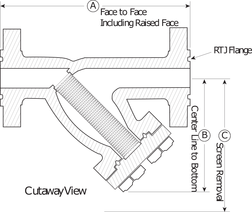 | SIZE (in) | A (in) FACE TO FACE | B (in) CENTER LINE TO BOTTOM | C (in) SCREEN REMOVAL | WEIGHT (lb) | FLOW COEFFICIENT (Cv) |