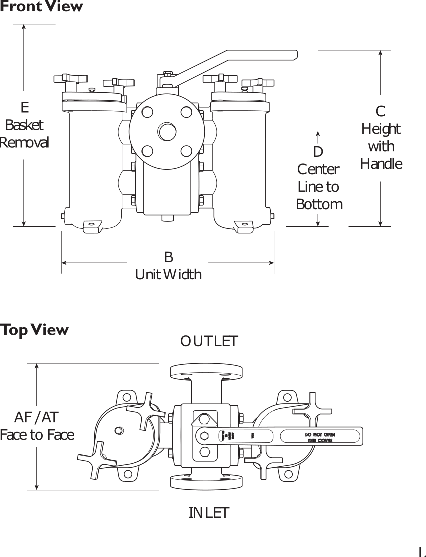 | SIZE (in) | AF (in) FLANGED FACE TO FACE | AT (in) THREADED FACE TO FACE | B (in) UNIT WIDTH (INCLUDES PLUG) | C (in) HEIGHT WITH HANDLE | D (in) CENTER LINE TO BOTTOM | E (in) BASKET REMOVAL | WEIGHT (FLANGED) (lb) | WEIGHT (THREADED) (lb) | FLOW COEFFICIENT (Cv) |