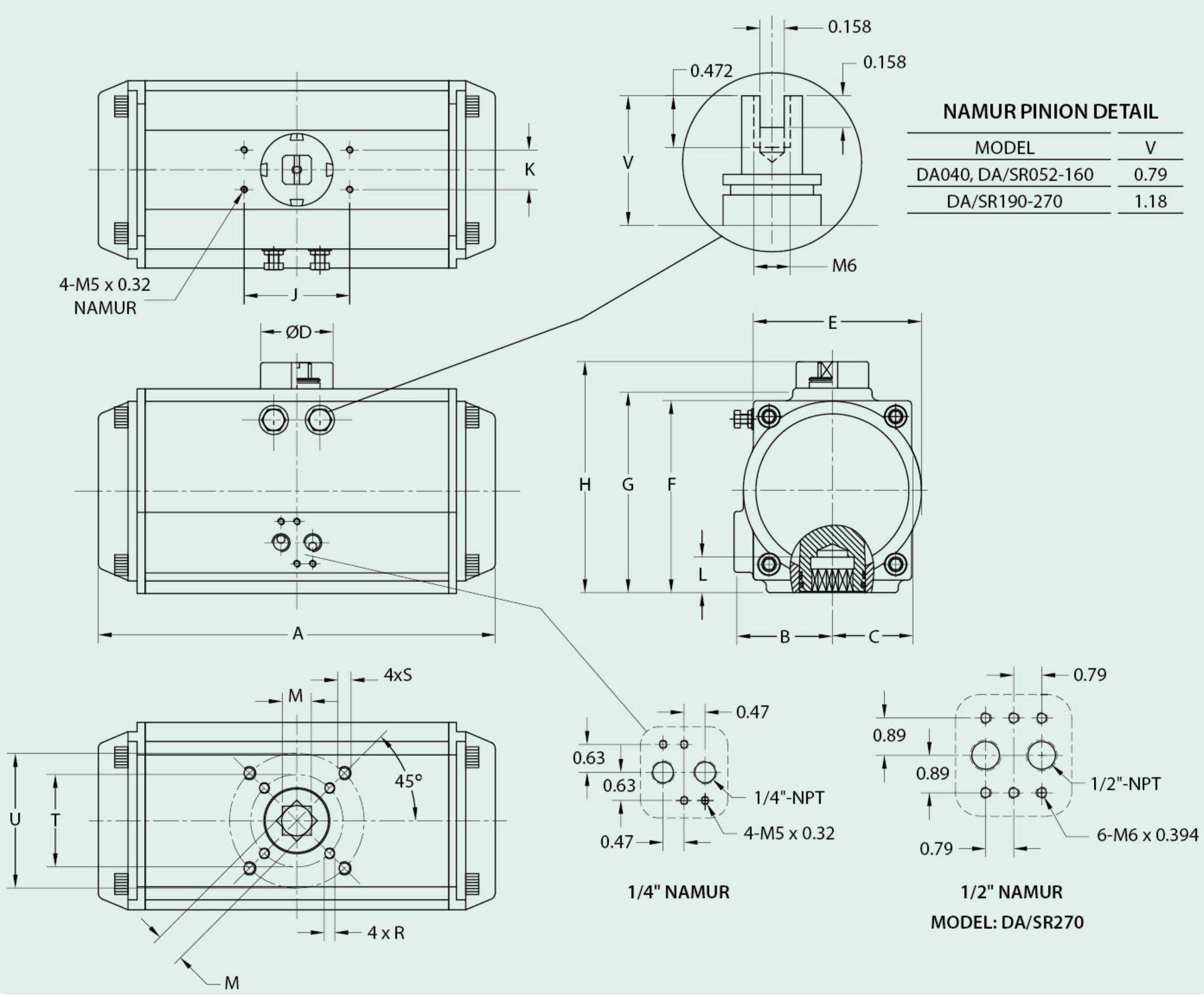 | DA/SR052 | 5.79 | 1.18 | 1.63 | 1.58 | 2.56 | 2.58 | 2.83 | 3.62 | 3.15 | 1.18 | 0.55 | 0.43 | M5 X 8 | M6 X 10 | F03/1.417 | F05/1.969 |