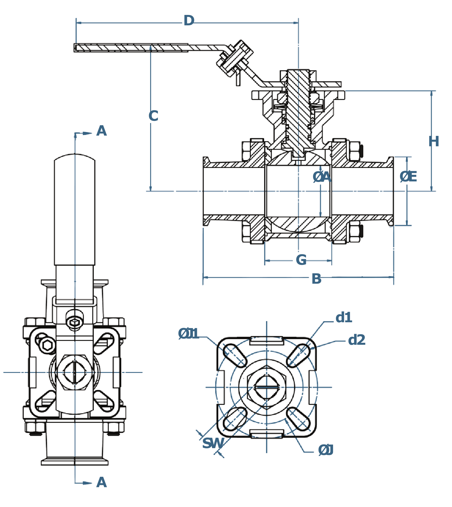 | SIZE (in) | A | B | C | D | E | G | H | L | J | J1 | d1 | d2 | SW | ISO5211 |