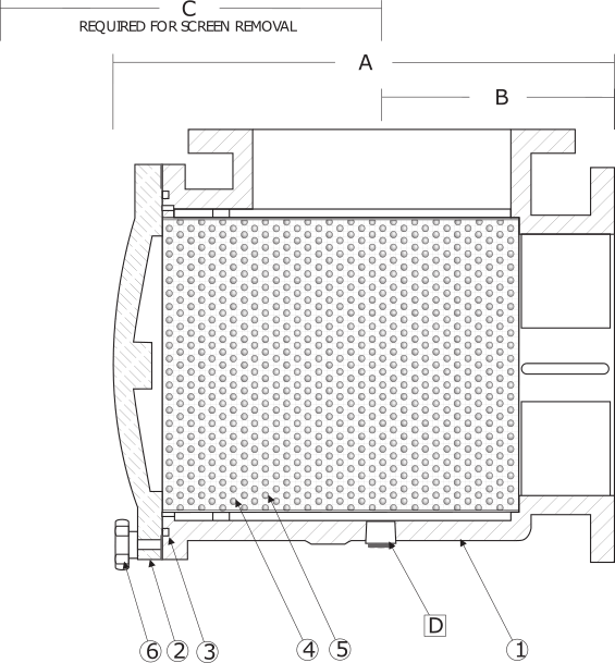 | SIZE (in) | A (in) TOP OF COVER TO FLANGE | B (in) CENTER TO FLANGE | C (in) SCREEN REMOVAL | D (in) N.P.T. | WEIGHT (lb) |